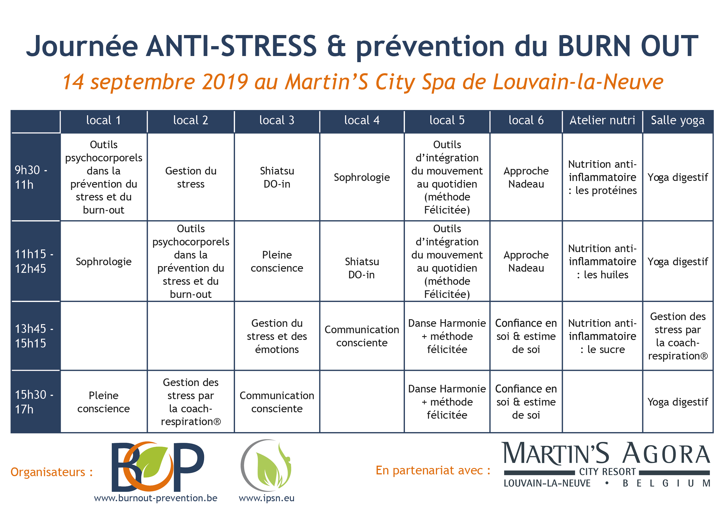 Pour faire suite aux conférences de la « Journée Anti-stress » du 25 mai 2019, nous vous proposons le 14 septembre 2019 à Louvain-la-Neuve en Belgique une journée entière d’ateliers pratiques qui vous permettront d’expérimenter différentes méthodes pour apprivoiser votre stress et vos émotions :