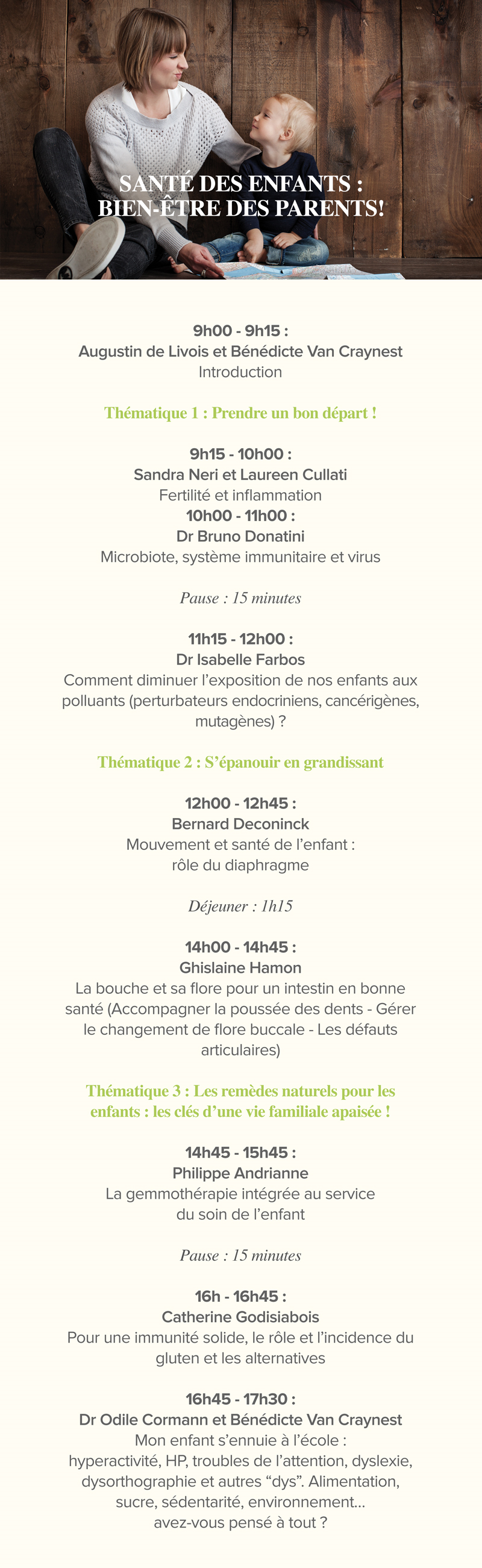 La santé des enfants est un sujet de préoccupation constant pour les parents. Alimentation, bonheur, mouvement, polluants, immunités, soins naturels… les questions sont nombreuses pour les parents et les réponses apportées souvent insuffisantes.